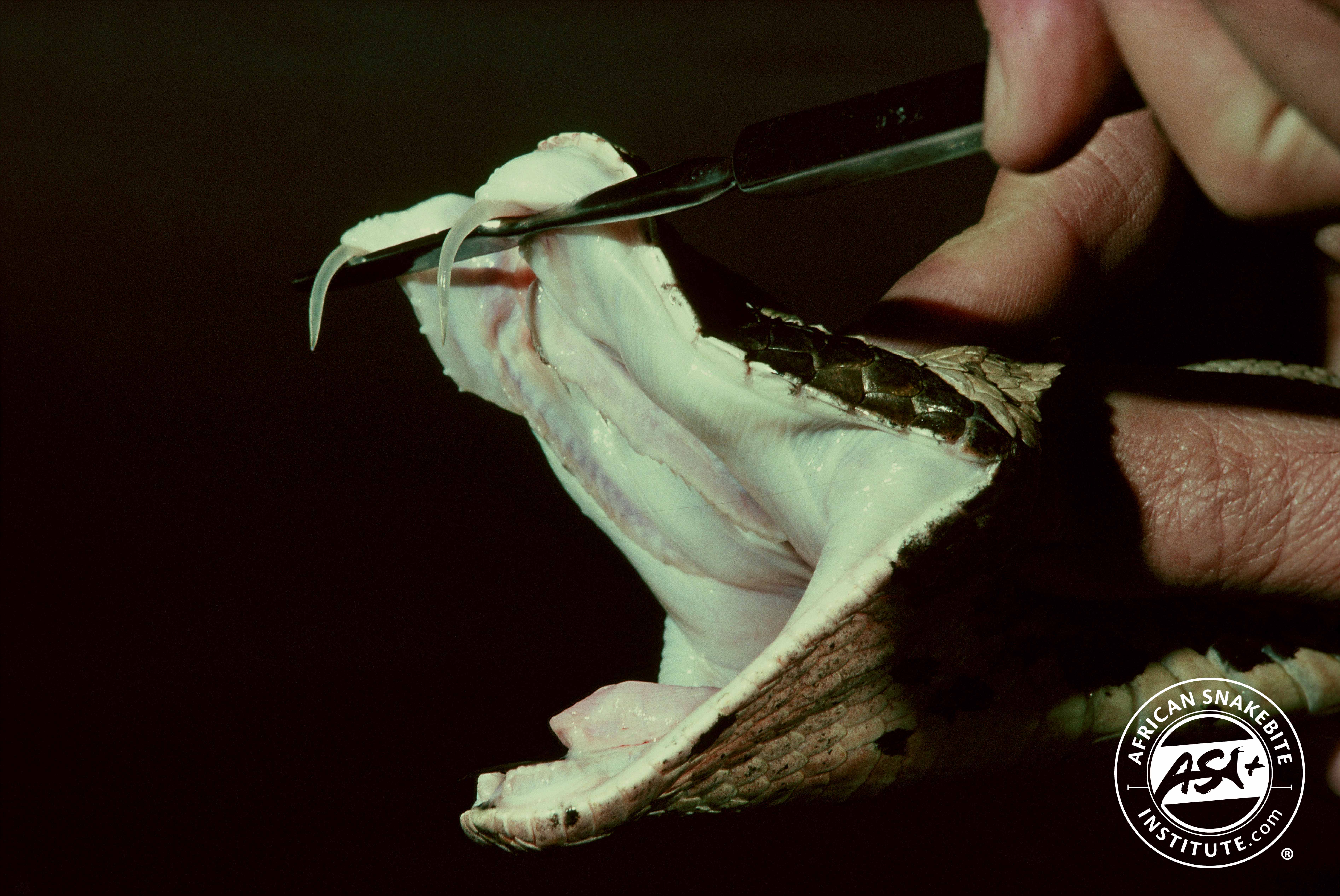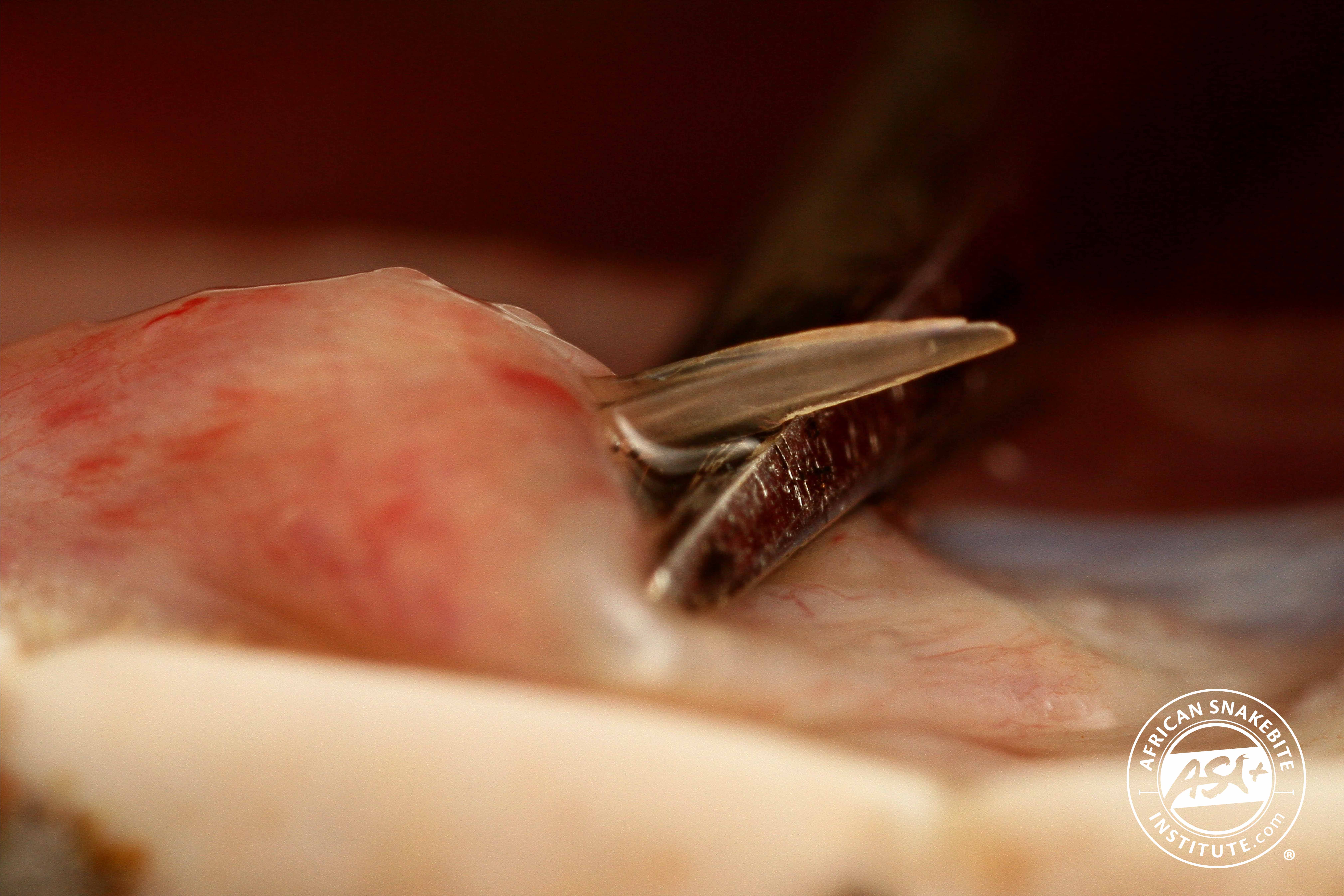 The massive fangs of a Gaboon Adder. In large specimens, these fangs may reach 4 cm in length.