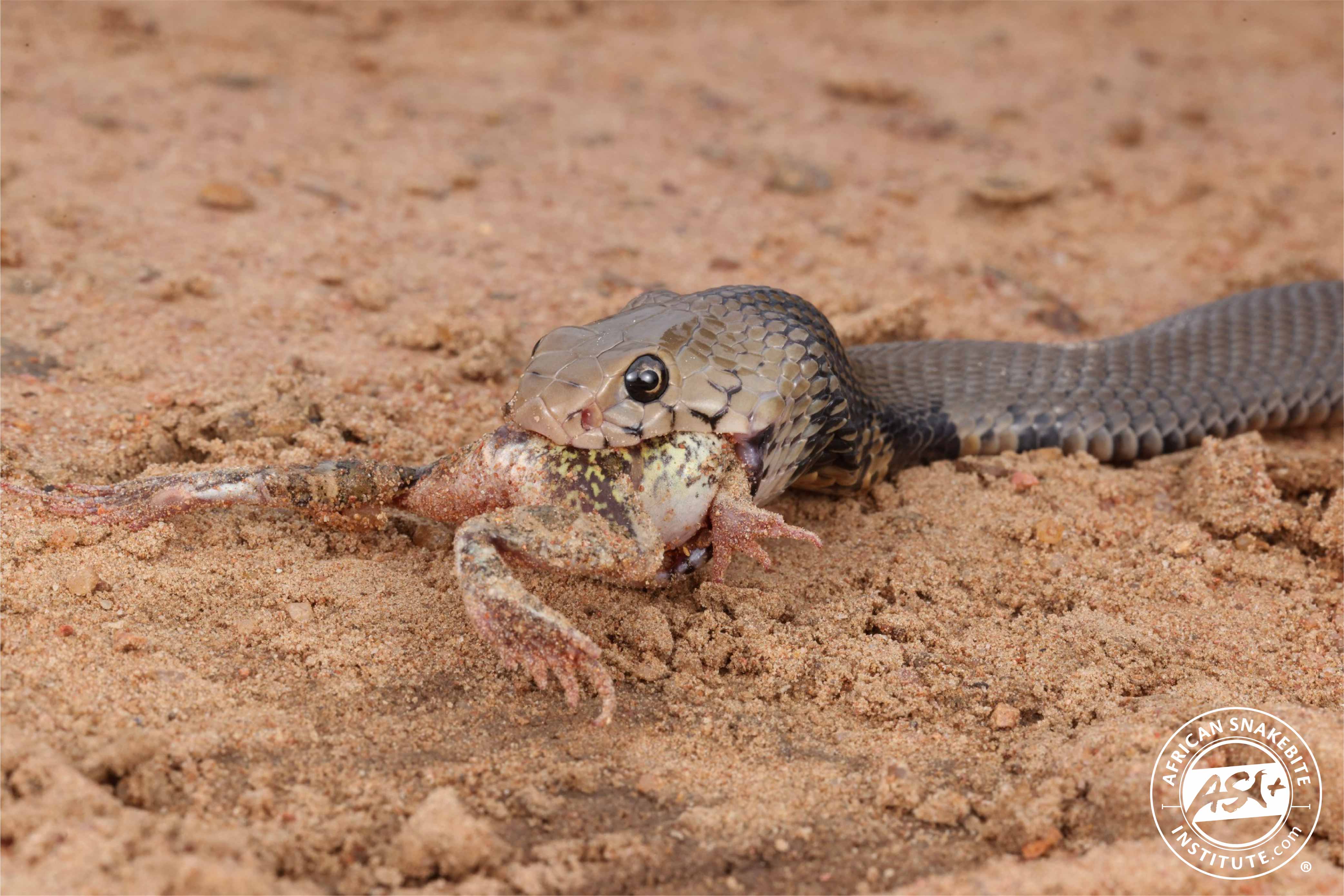 A young Mozambique Spitting Cobra (Naja mossambica) feeding on a small Sand Frog.