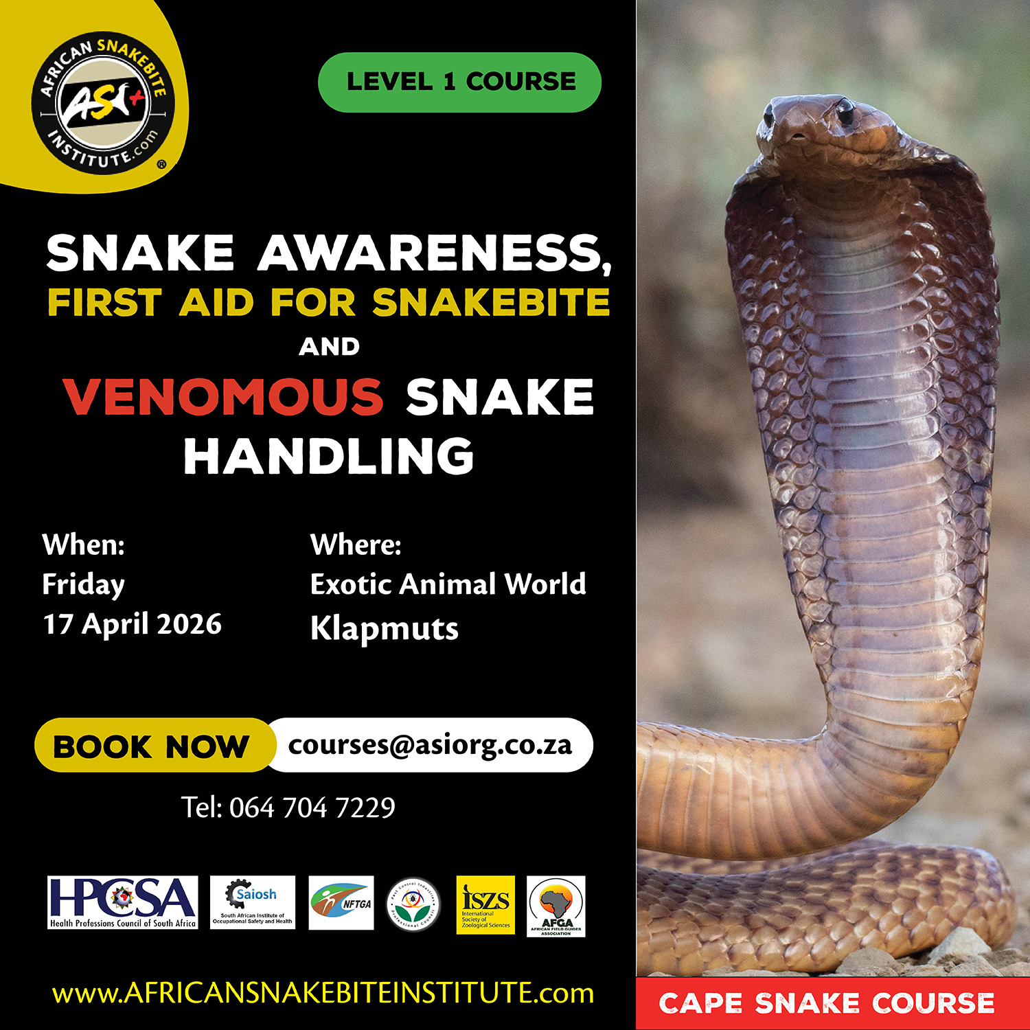 The African Snakebite Institute (ASI) offers a variety of courses including Snake Awareness, Scorpion Awareness and Venomous Snake Handling. ASI is accredited by the International Society of Zoological Sciences (ISZS) and is a Travel Doctor-approved service provider. The courses are also accredited by the Health Professions Council of South Africa (HPCSA). ASI is the largest provider of quality snake handling and safety equipment in Africa!