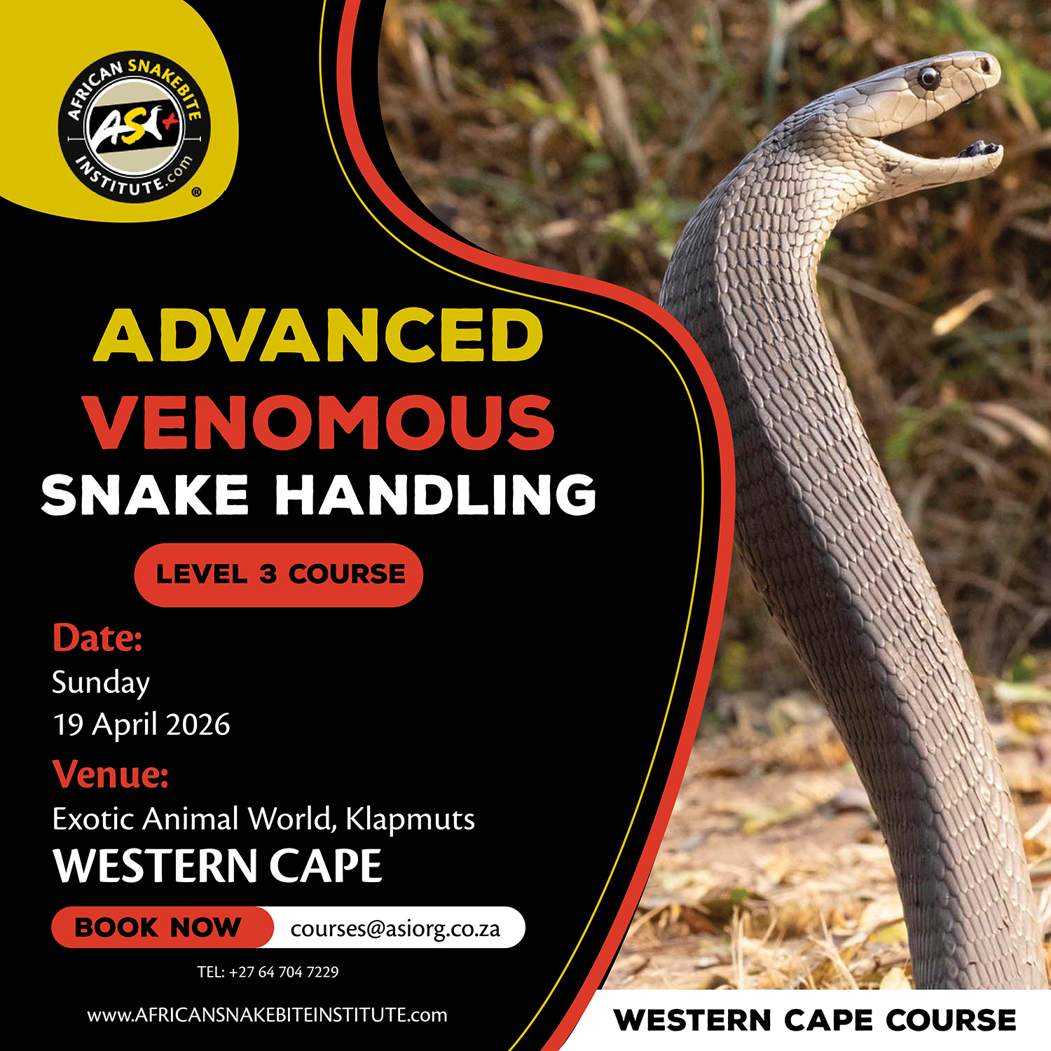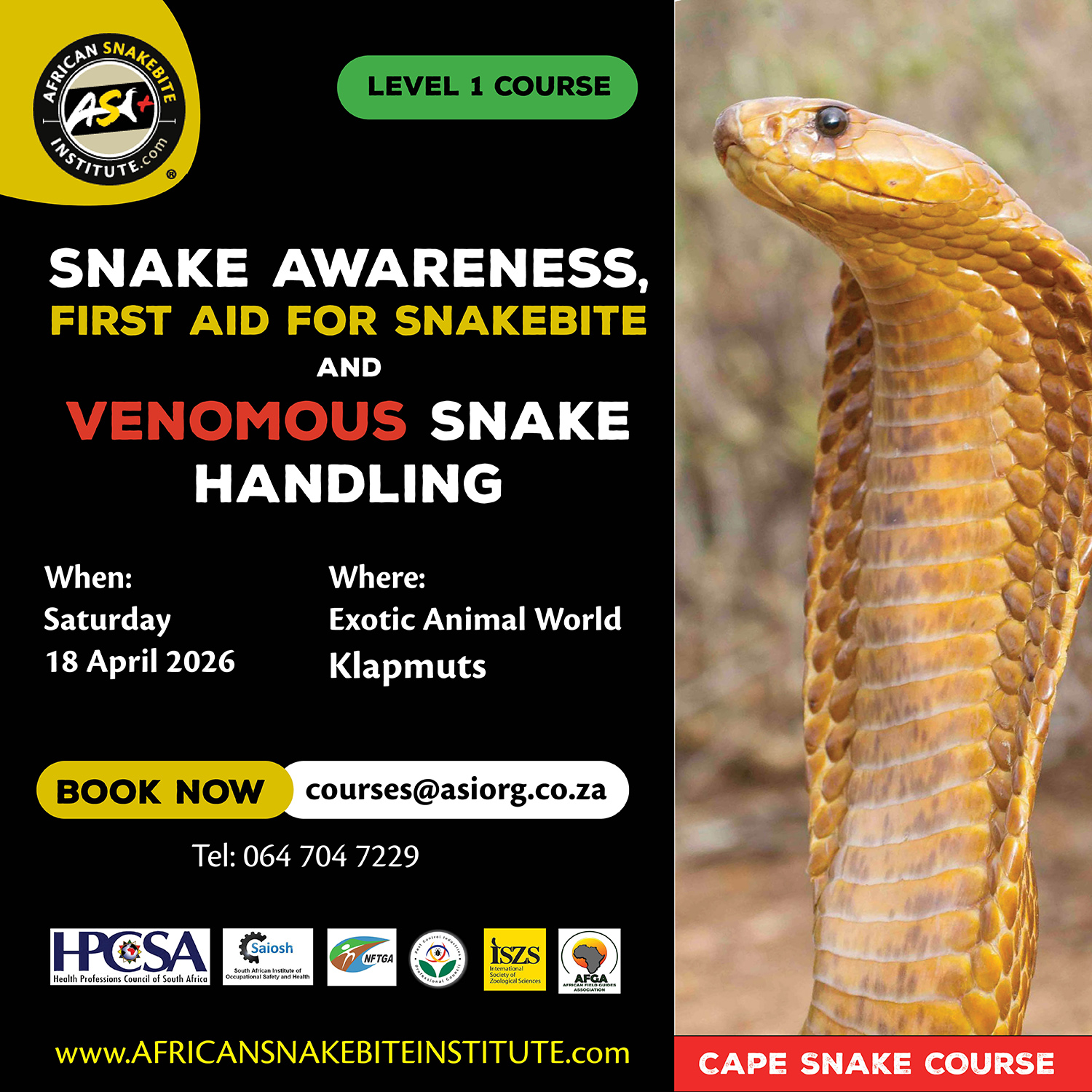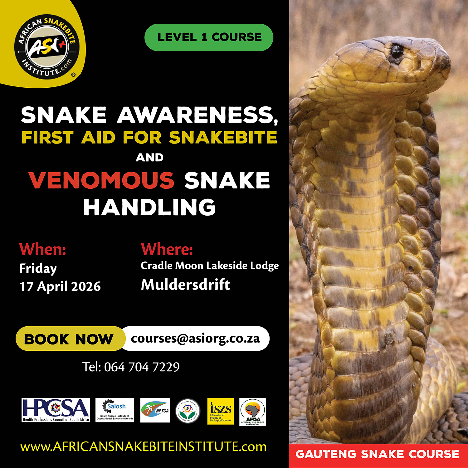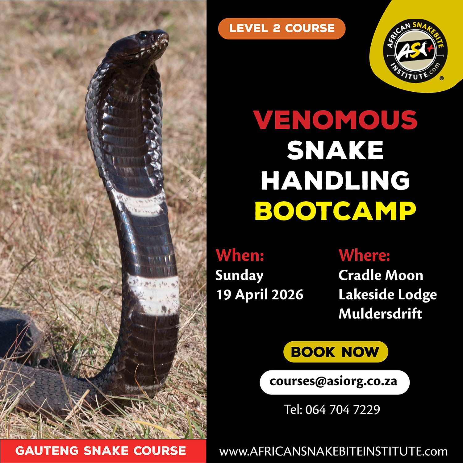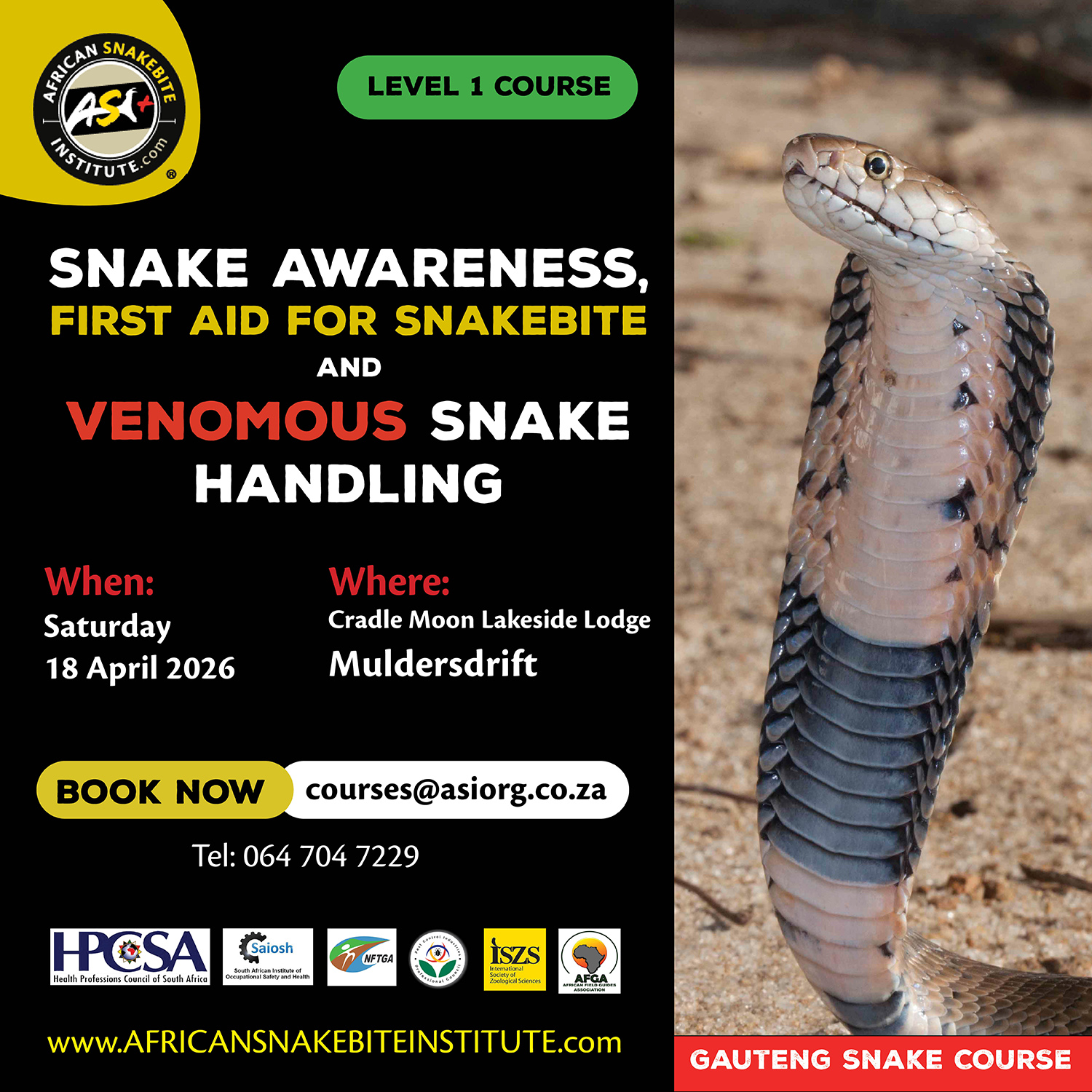 - Snake Awareness courses: The African Snakebite Institute has a large variety of online and in-person Snake Awareness & Venomous Snake Handling courses. We are the leading training provider of Snake Awareness, First Aid for Snakebite, and Venomous Snake Handling courses in Africa. If you are nervous of snakes or would like to learn more and build some confidence, come join us on one of our weekend public courses. You can find future dates on our website.