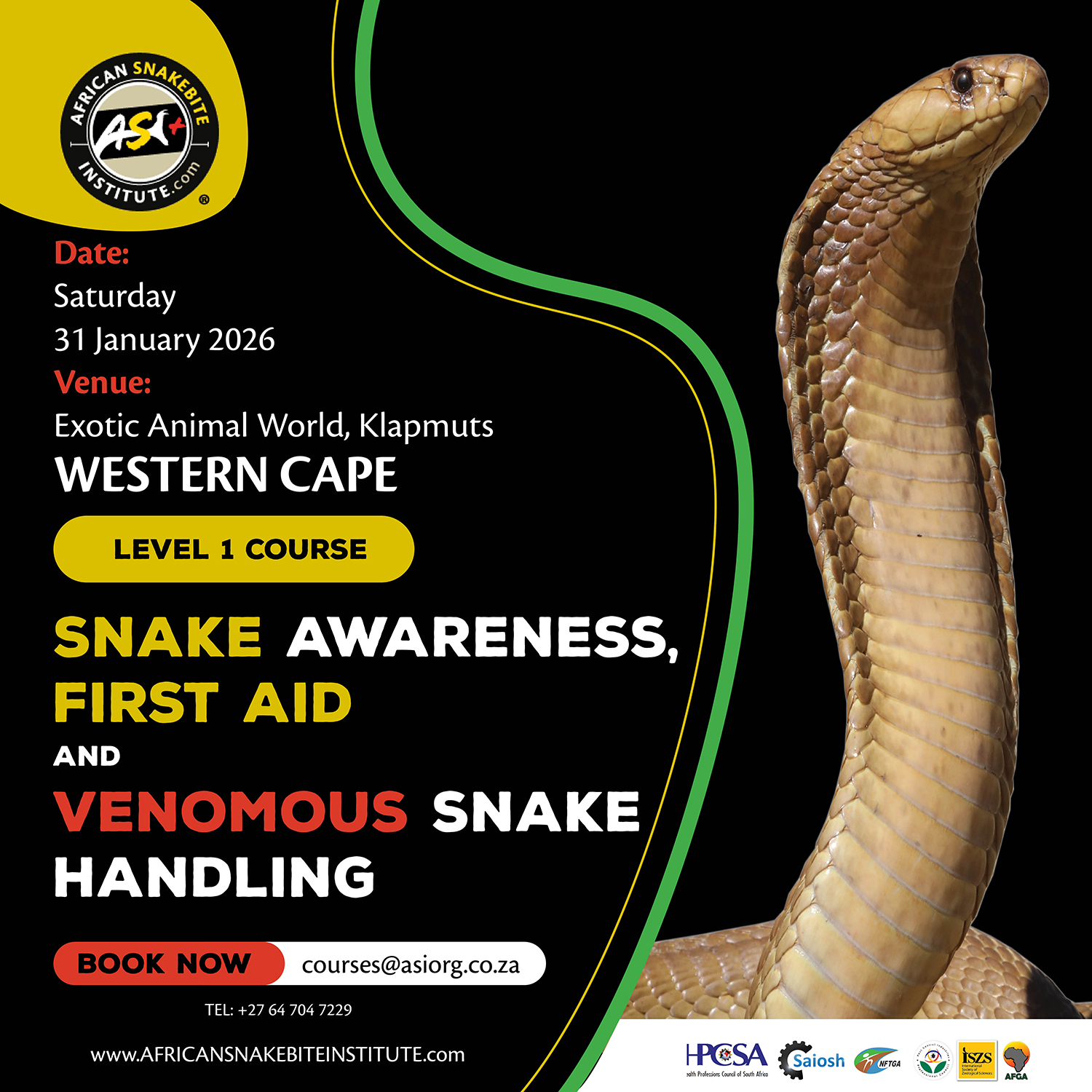 Johan Marais is the author of various books on reptiles including the best-seller - A Complete Guide to Snakes of Southern Africa. He is a popular public speaker and CEO of the African Snakebite Institute. The African Snakebite Institute (ASI) offers a variety of courses including Snake Awareness, Scorpion Awareness and Venomous Snake Handling. ASI is accredited by the International Society of Zoological Sciences (ISZS) and is a Travel Doctor-approved service provider. The courses are also accredited by the Health Professions Council of South Africa (HPCSA). ASI is the largest provider of quality snake handling and safety equipment in Africa!