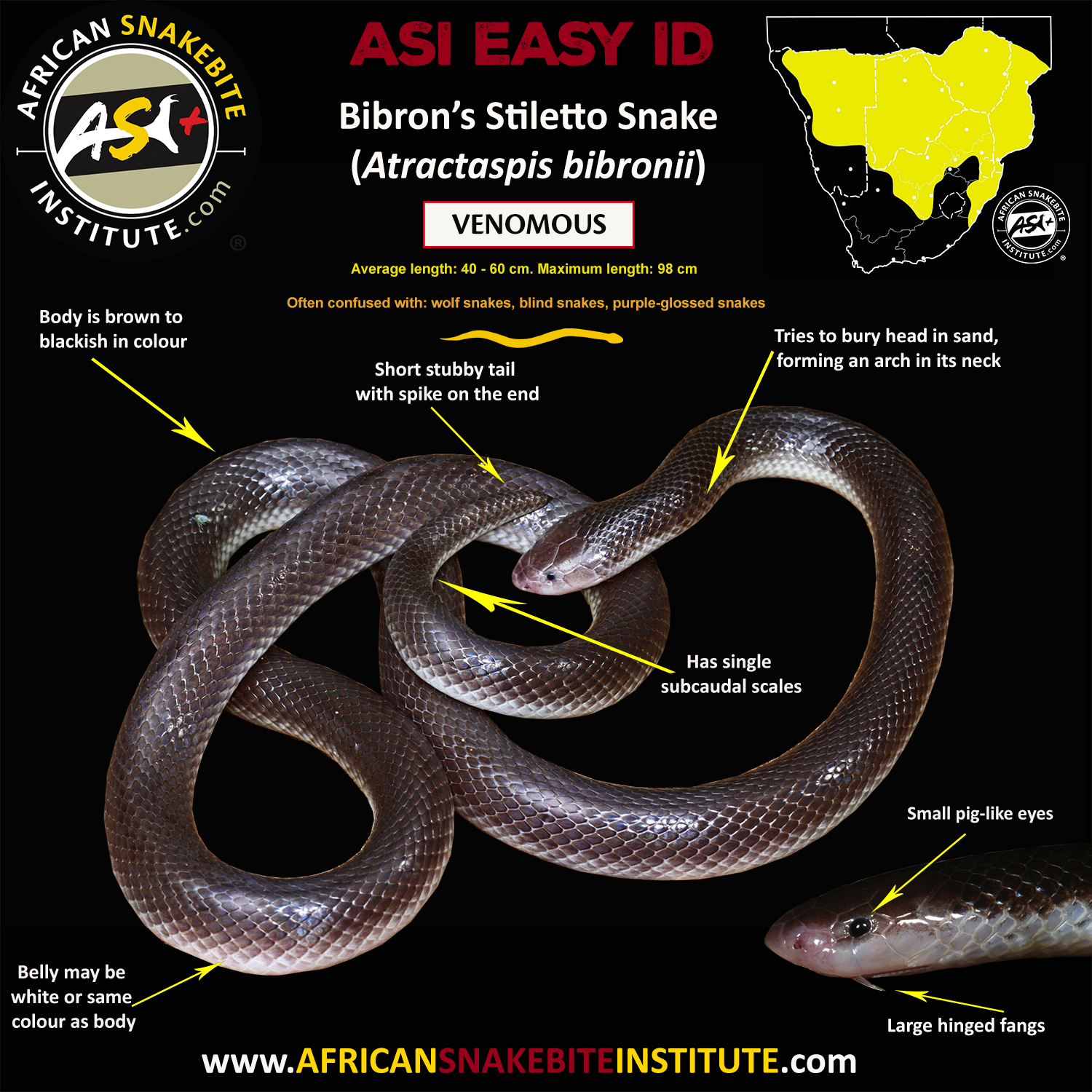 A special mention is needed for this species, as we are seeing a surge in reported bites. The Stiletto Snake (Atractaspis bibronii) is a fossorial species that spends most of its life underground, hunting other snakes and lizards. It often emerges in the early evening, especially after rain. This snake is difficult to identify and is frequently mistaken for harmless species. Unfortunately, it is quite venomous and as it has long fangs that can protrude from the sides of the mouth while it is closed, this snake cannot be handled safely in any manner.